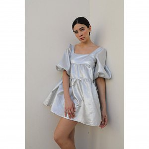 Silver one-shoulder mini dress.